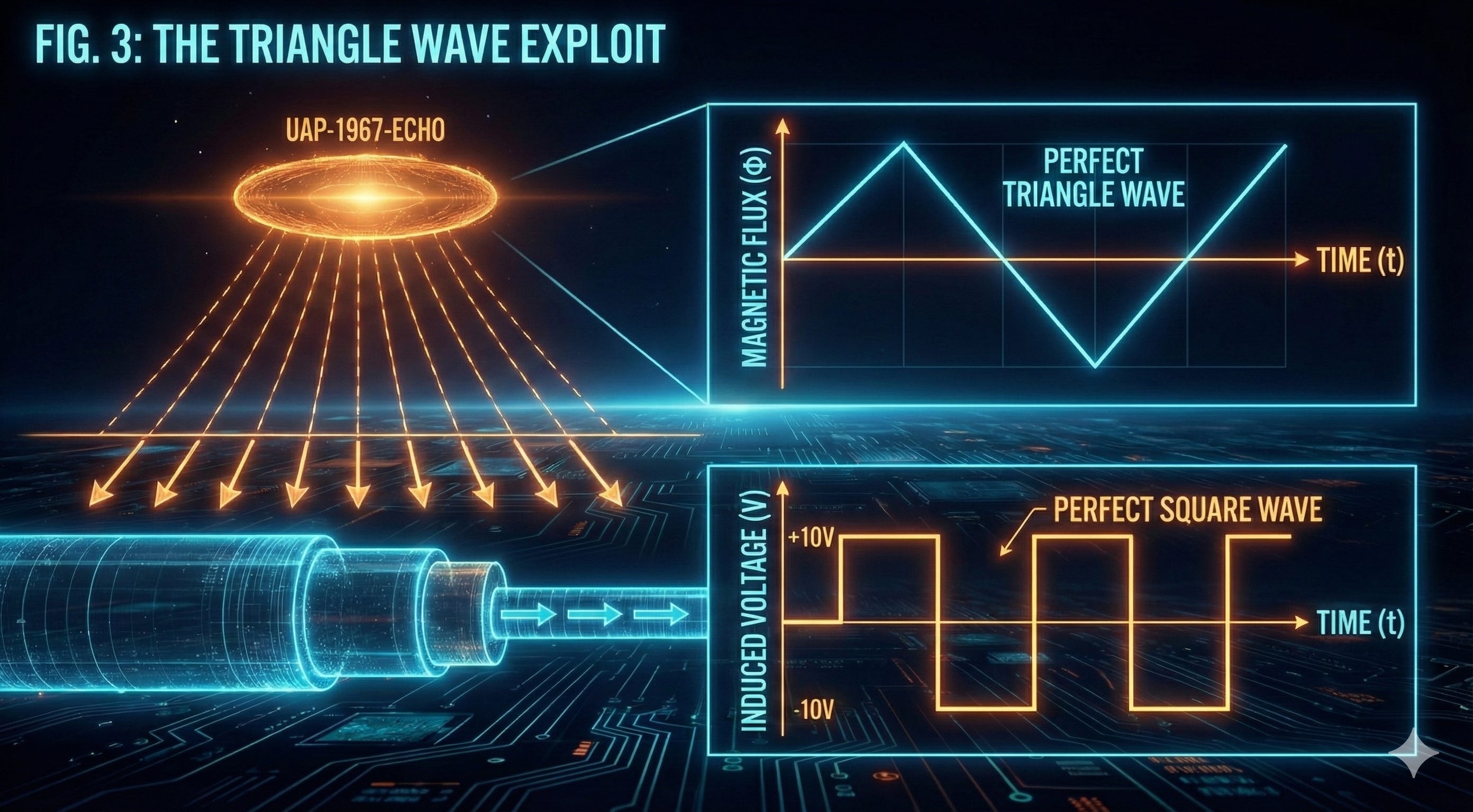 The Execution: The Operator generated a high-intensity magnetic Triangle Wave. By ramping their magnetic field up and down with perfect linearity, they induced a constant positive and negative voltage in the buried cables.