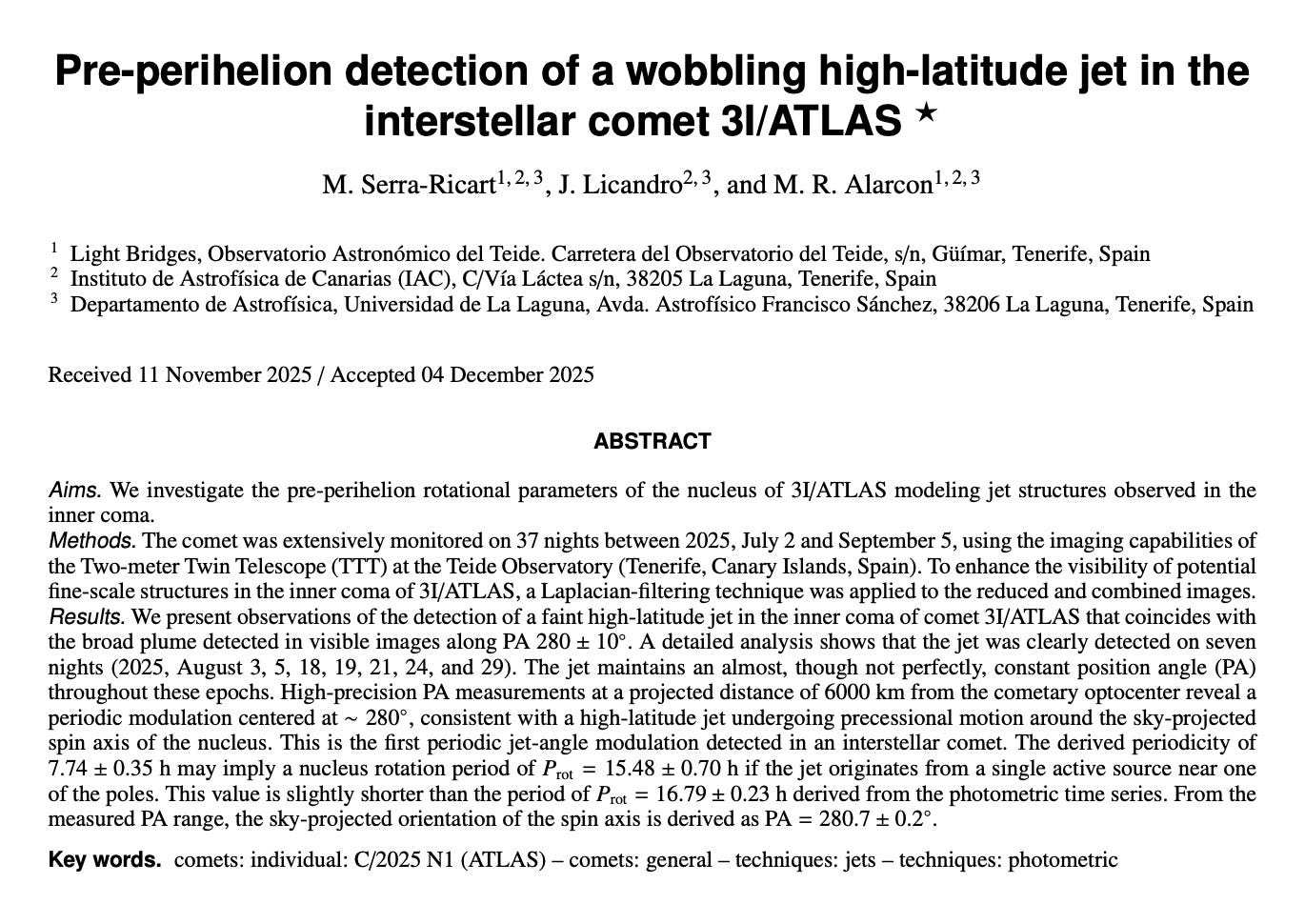 The paper, titled Pre-perihelion detection of a wobbling high-latitude jet in the interstellar comet 3I/ATLAS, is based on 37 nights of monitoring using the Two-meter Twin Telescope (TTT) in the Canary Islands.