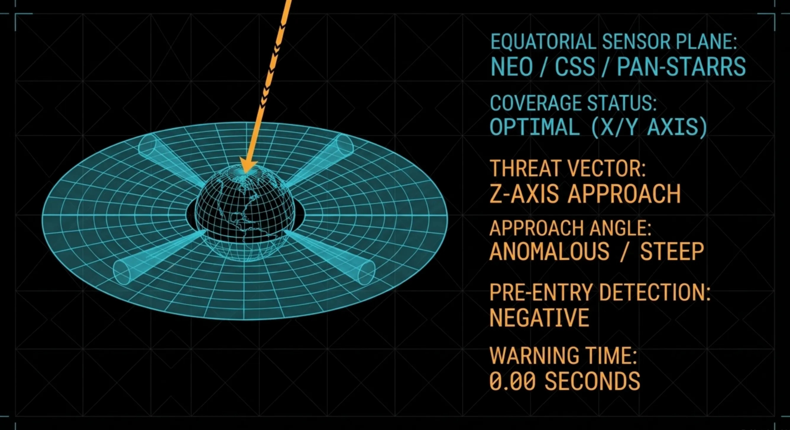 That is technical language for a simple problem. The object came in steep. Outside the plane where our detection systems are looking.