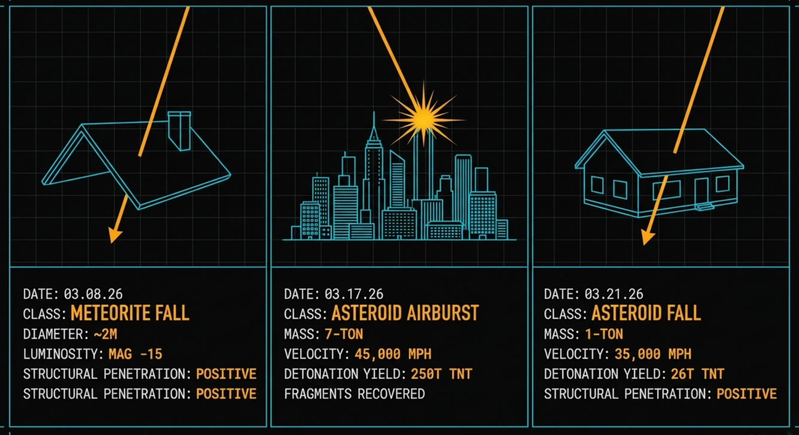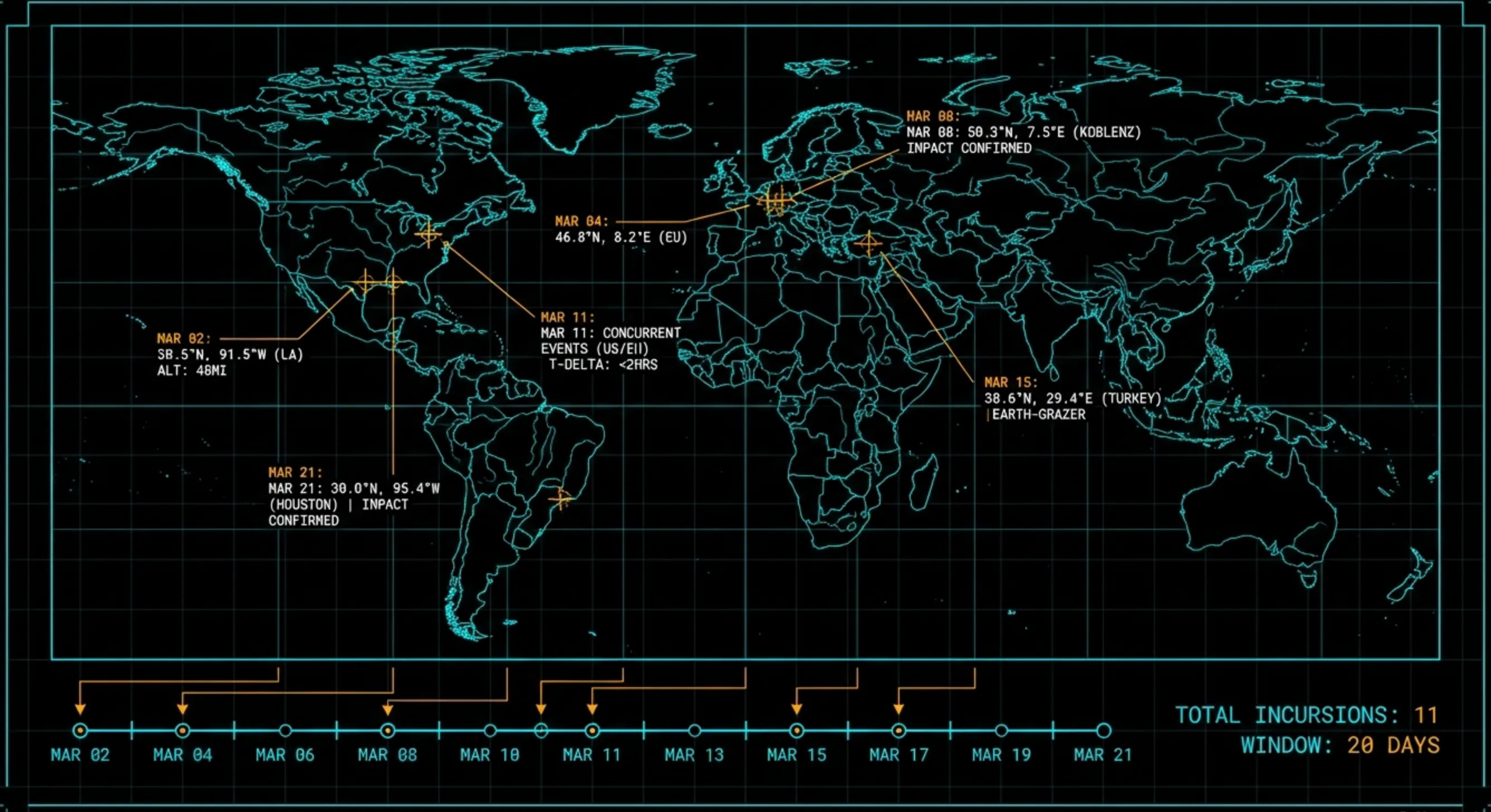 In the twenty days between March 2 and March 21, 2026, eleven confirmed sporadic fireball events struck Earth’s atmosphere across four continents. Three produced meteorite falls. Three struck structures. Two detonated over major American cities in broad daylight with zero advance warning. All were classified as sporadic. None were associated with any known shower.