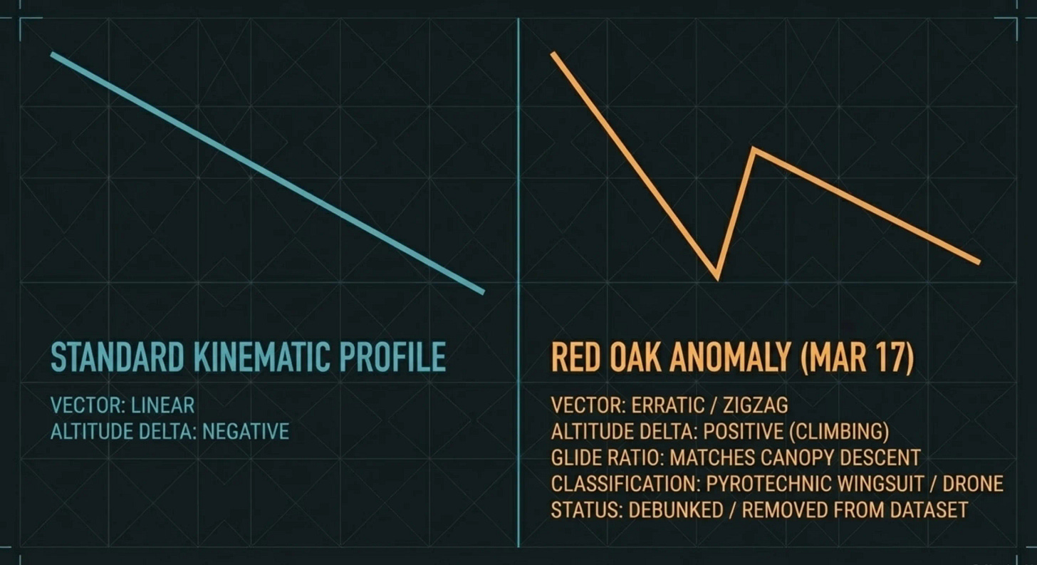 As of March 22, neither NASA nor the AMS has classified the Red Oak object. The movement profile is physically inconsistent with any natural space object. Meteors travel in straight lines. They do not change direction, gain altitude, hover, or zigzag. The object’s trajectory is consistent with a wingsuit pilot carrying pyrotechnics or a drone with incendiary payload. During the pyrotechnic burn phase, the object maneuvers under apparent control. The moment the flares extinguish, it transitions to a glide-ratio descent with lateral movement and slow altitude loss, exactly matching a human under canopy.