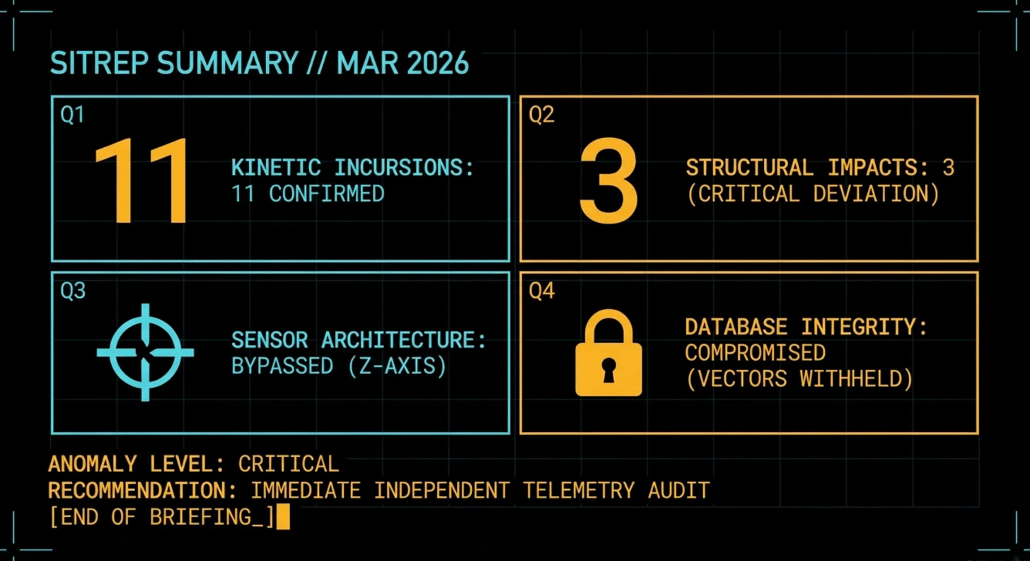 Previous briefings: The Weigh-In | The Verdict | The Ancient Engine | The Curated Orbit | The Long Count | The Green Burial | The Dead Drop | The Ghost General | Forensic Audit: The Covert Space Force Mobilization | The 2028 Imperative | The Wide Angle | The Ignition Sequence | The Ghost Coma | The Heartbeat | The Surge | The Silent Edit | The Suppression Gradient | CONFIRMED: The TESS Contingency | The Glomar Confirmation | The Three Days of Darkness | The SPHEREx Intercept | Incident Report: The MAVEN Silence | SITREP: The Pacific Diversion | Project Archimedes | Launch Anomaly: Project Square | The December Intersection | The Sentinel Dossier | Dossier 001: The Geometry of Contact