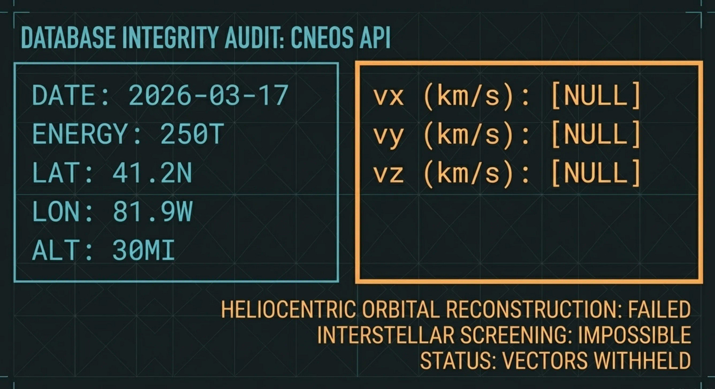 The CNEOS fireball database is the only global dataset of bolide events. It is populated by classified U.S. Government military sensors. It publishes no per-event uncertainties. It explicitly states it is “not meant to be a complete list.” It is not updated in real-time. And the velocity vector data, the vx, vy, vz components that would allow anyone to compute heliocentric orbits and screen for interstellar origin, is published on a separate timeline from the narrative event reports.