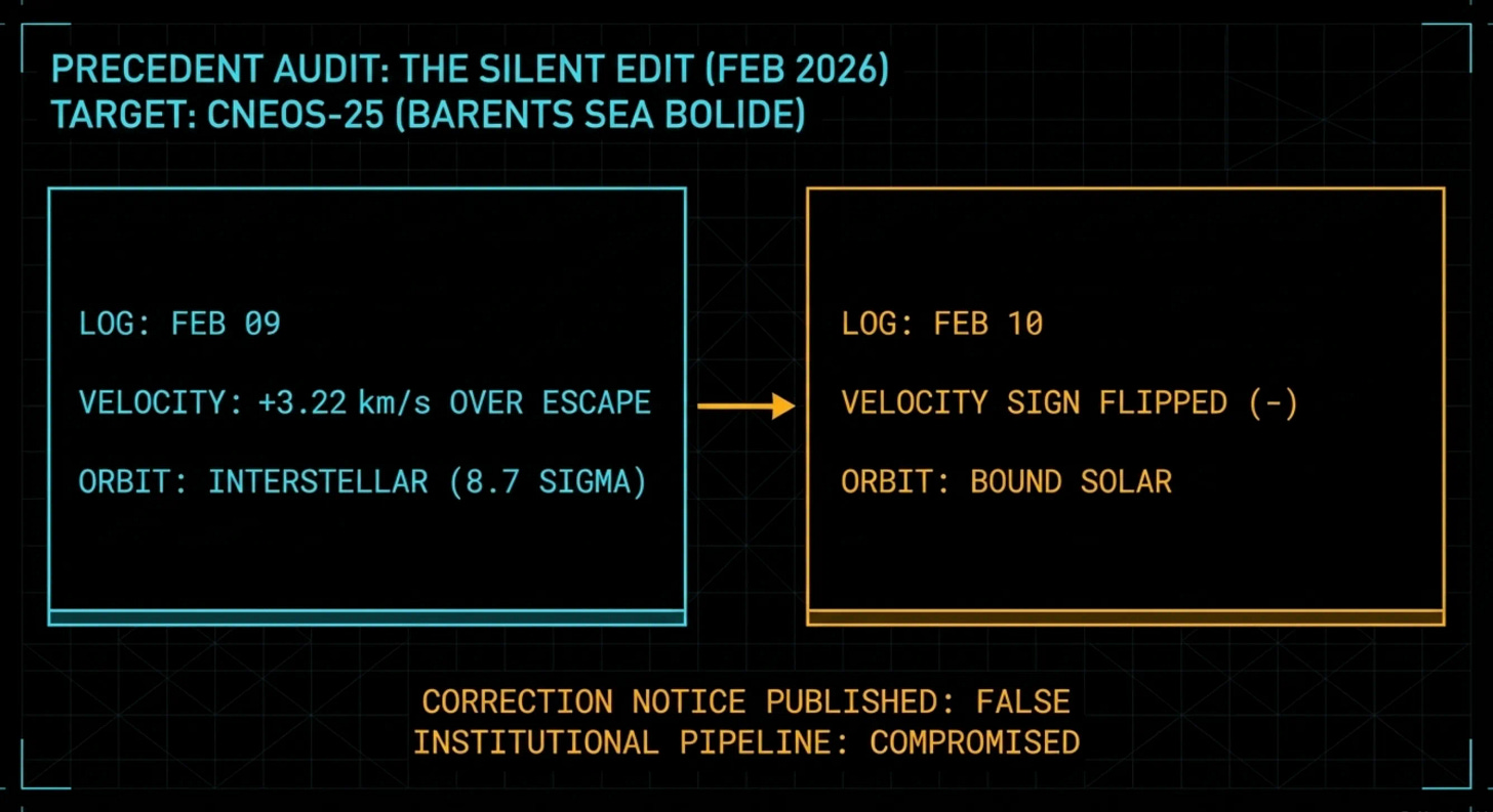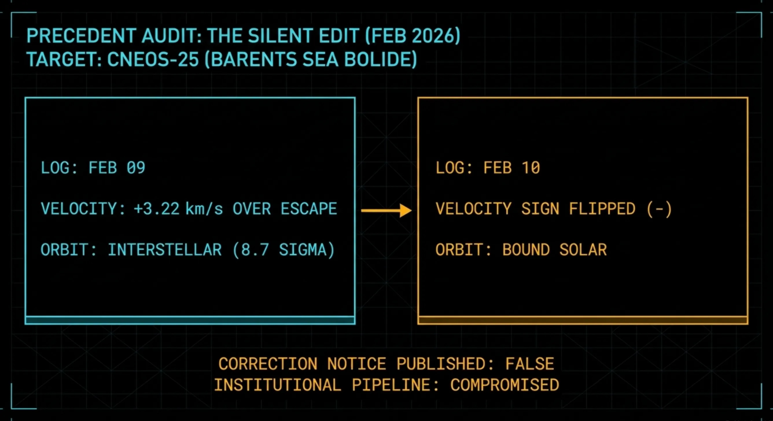 Less than 24 hours after the paper went public, NASA/JPL updated the CNEOS database. No press release. No footnote. No correction notice. They flipped the sign on one velocity component of the 2025 meteor, mathematically forcing it back into a solar system origin. Loeb caught it because he had screenshotted the original data and compared it to the Internet Archive. The before and after are public. We published them.