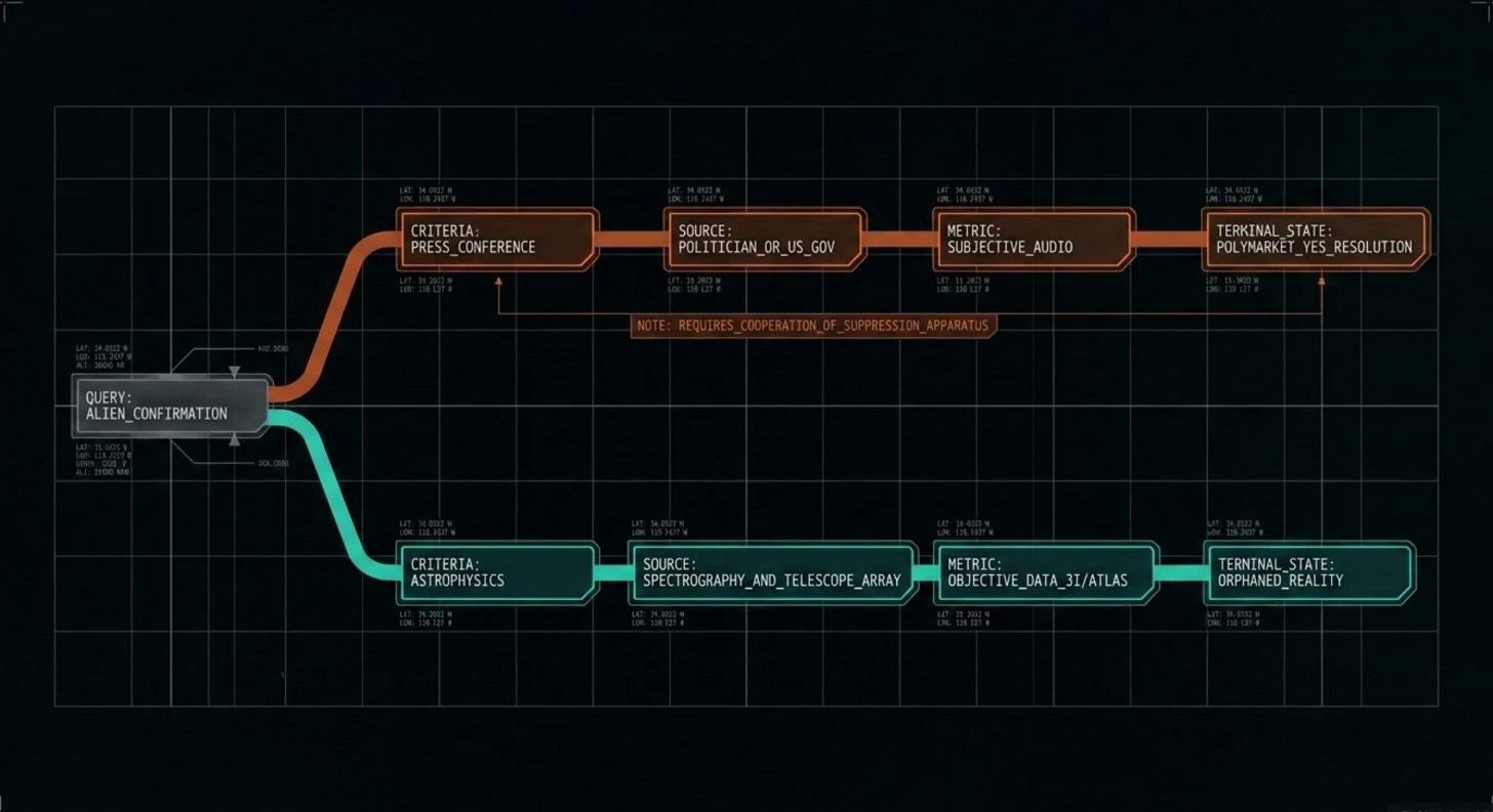 So the traders moved on to the next contract. Will the government confirm aliens by 2027? Will Trump declassify UFO files? Will aliens.gov turn out to be an immigration website? Each question is a bet on a headline, not on an object.