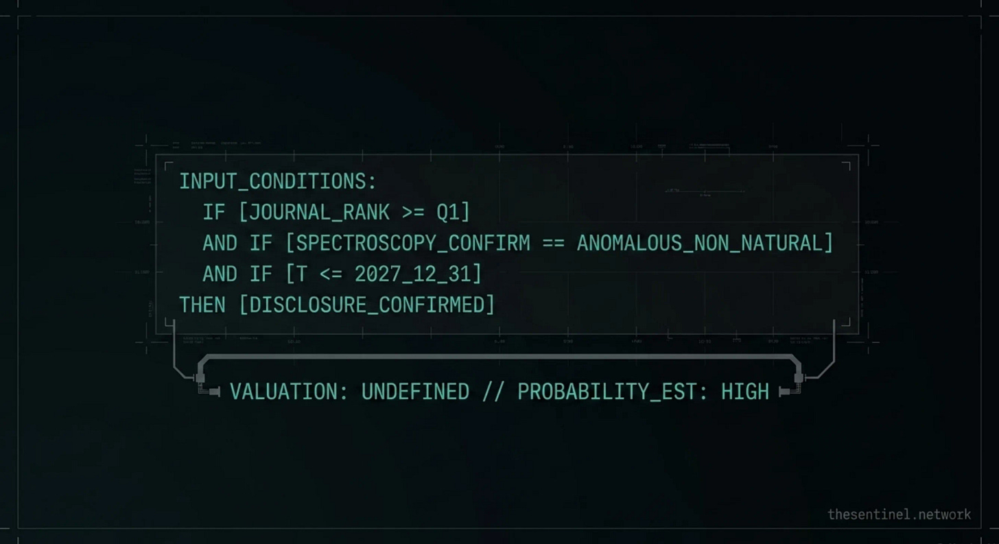 Twenty-five million dollars in prediction market volume on alien disclosure is not a curiosity. It is a signal. It tells you that a large, financially motivated audience is paying attention to the question and is willing to put capital behind their analysis. That audience is currently betting on a political event. This publication has spent five months and fifty-nine briefings documenting why a political event is the least likely resolution pathway. We have scored every prediction we have made. The record is public. The suppression apparatus does not confirm things. It manages them. It manages journals. It manages databases. It manages disclosure advocates. It manages the corporate architecture that turns alien speculation into Super Bowl ads. And it manages the narrative that keeps the question on the felt instead of in the data. If confirmation comes, it will come from the data, and it will come over the objections of the institutions the traders are watching. The market is looking at the wrong scoreboard.