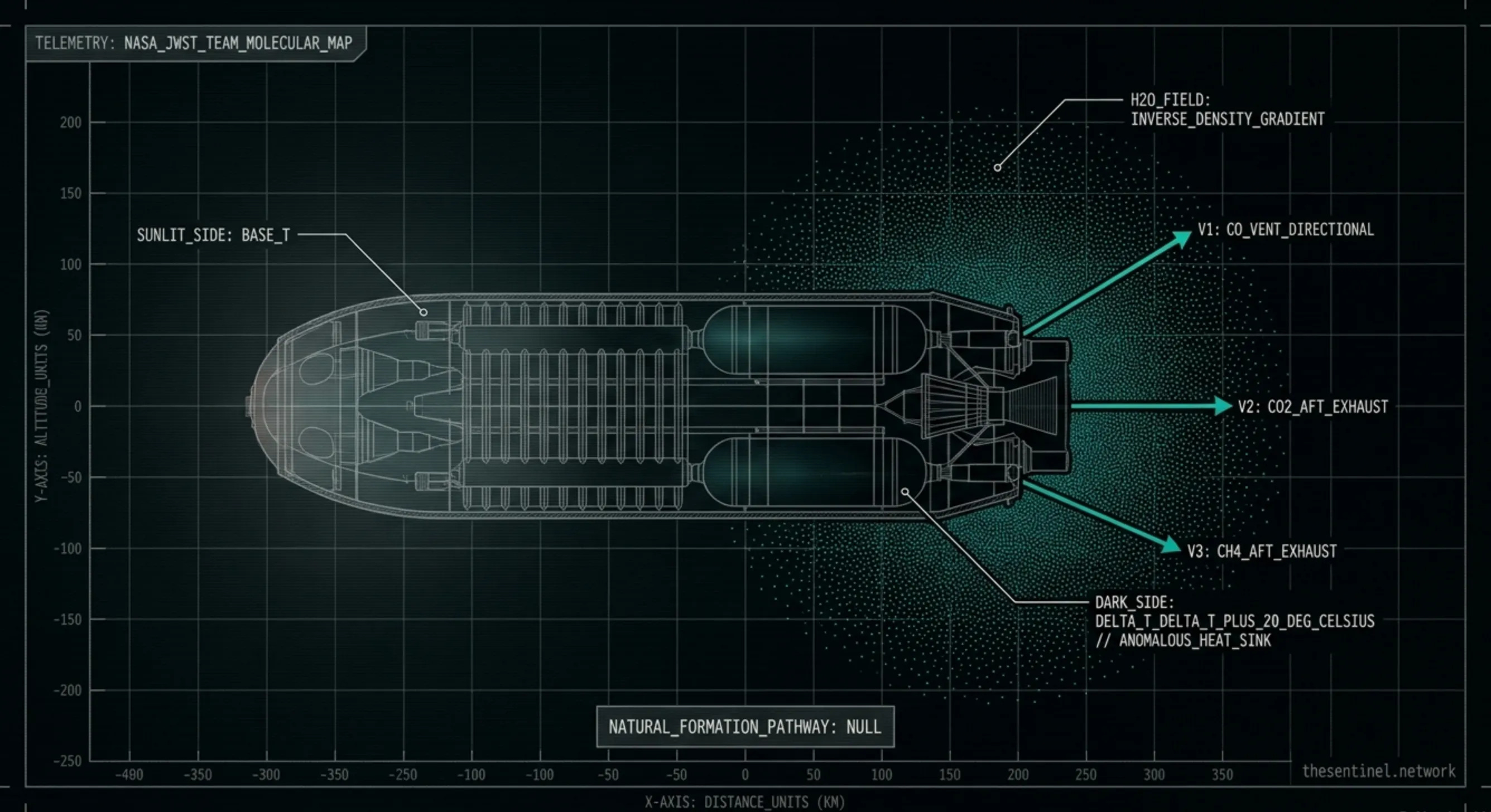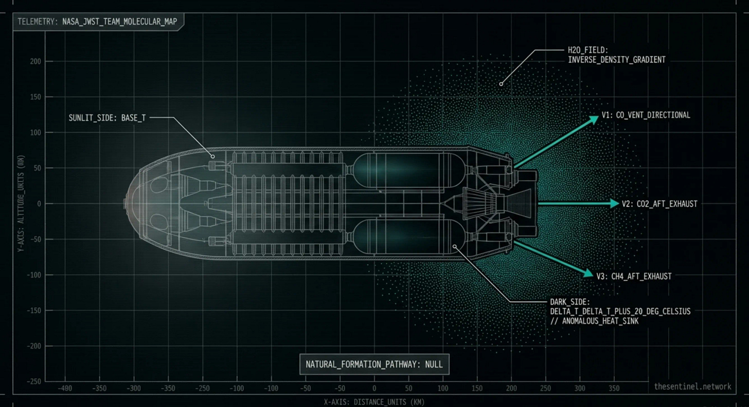 In THE OPERATING SYSTEM, we documented what happened when NASA’s own JWST team mapped the gas cloud around 3I molecule by molecule. Five chemicals venting in five different directions from one object. Carbon monoxide through directional vents. Carbon dioxide and methane out the back. Water distributed through a field that gets denser as you move away from the surface. The dark side running twenty degrees hotter than the sunlit side. Their own best simulation could not reproduce what they measured.