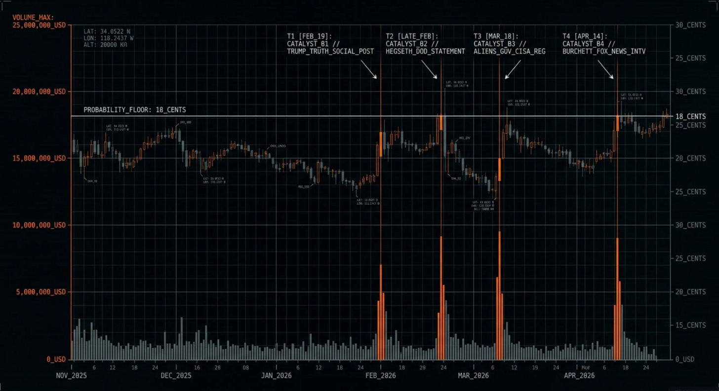The traders at the table are not pricing the probability of alien life. They are pricing the probability of a press conference. They are betting on disclosure as a communications event, not as a scientific conclusion. And that means every dollar in the pool is a bet on the behavior of the same institutions that this publication has spent five months documenting as actively suppressing the evidence.