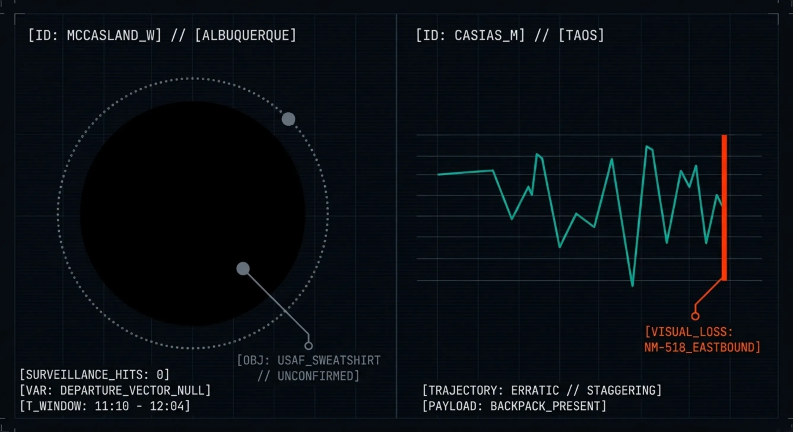 Casias (June 2025, Taos): both phones factory-reset. Carrying a backpack. Staggering on camera. Not a drinker. Never found.