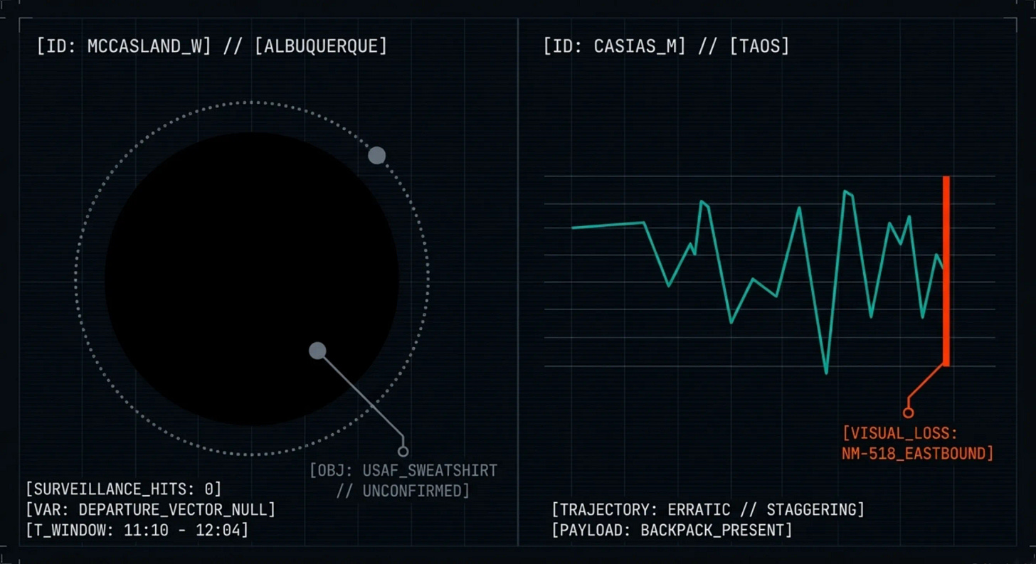 While we tracked the press conference, we also pulled a thread on Melissa Casias that changes the texture of her disappearance. The Taos News reported details we had not previously documented. Surveillance footage from a Talpa residence on NM-518 captured Casias walking eastbound, carrying a backpack, roughly an hour after she dropped off lunch to her daughter on June 26, 2025. Her husband Mark Casias, a Superintendent III at LANL, relayed what a witness reported: “He said she was staggering across the road like she was hurt or intoxicated, which she’s not a drinker.”