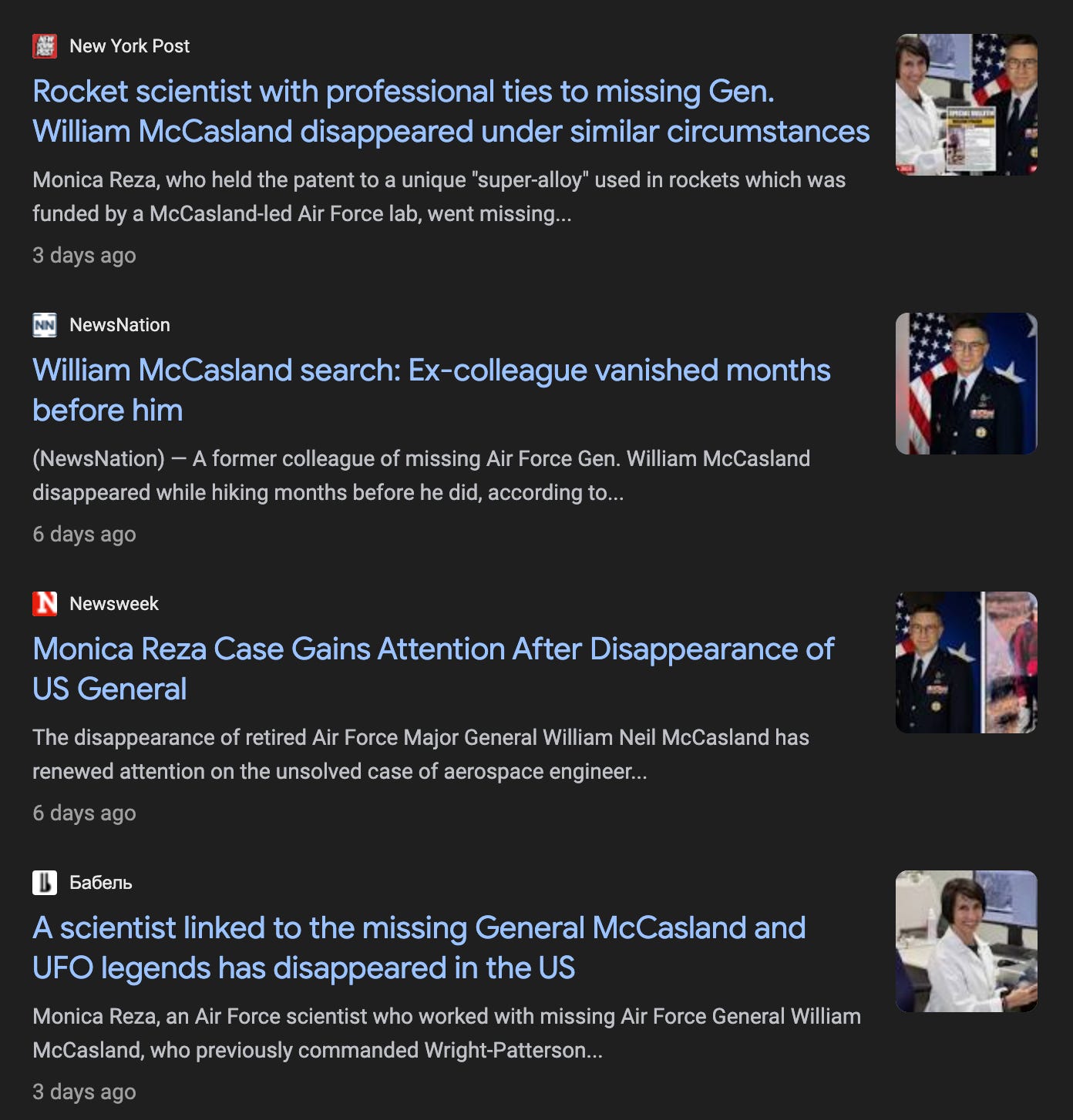 CNN ran the McCasland story with details we surfaced about his AFRL command history. Fox News did the same and mapped the one-hour vanishing window. ABC News ran our connections and detailed the search operations. Newsweek brought in a former FBI agent and talked about details first covered here. And on Saturday, NewsNation reported the connection this publication documented first: that Monica Jacinto Reza, the inventor of Mondaloy, vanished nine months before the general who oversaw the budget that funded her work. They named the specific directorate: the Air Force Research Laboratory Space Vehicles Directorate.