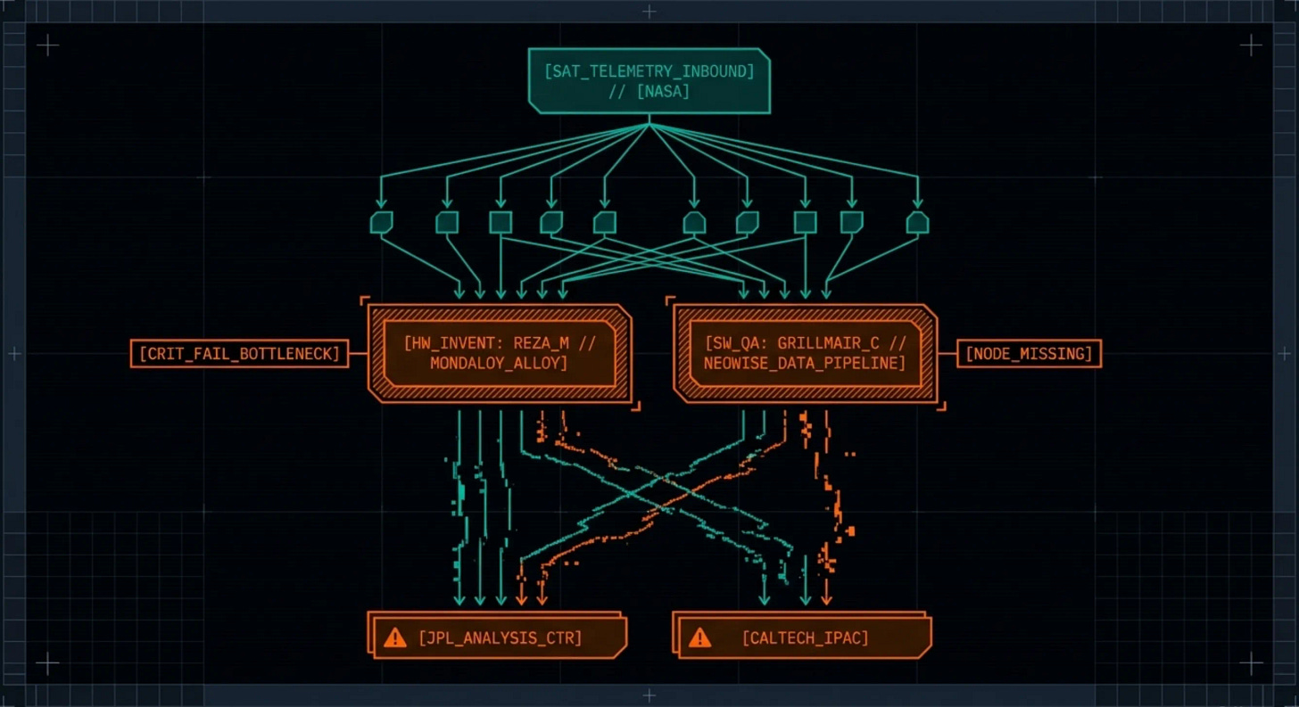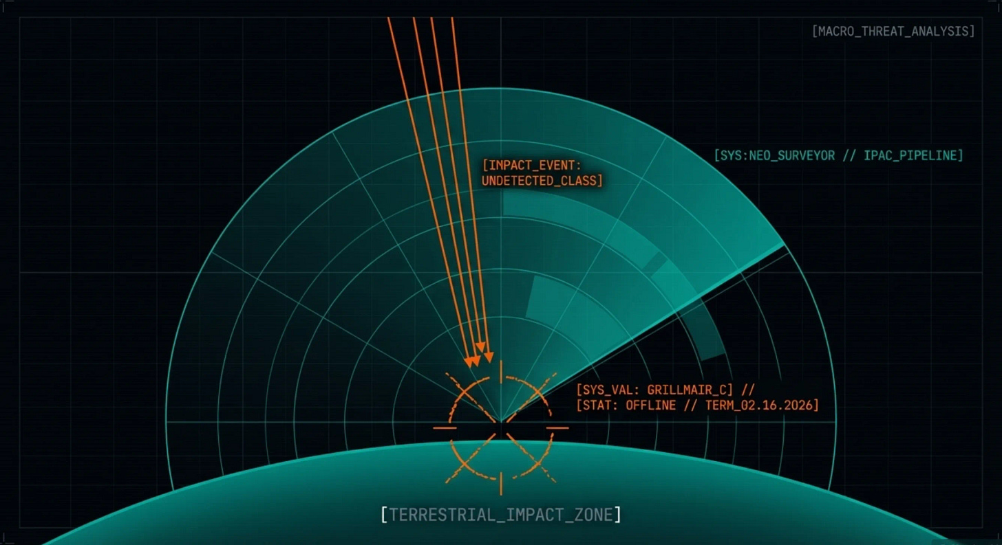 The system designed to close that detection gap is NEO Surveyor, the first space telescope purpose-built to find objects that could hit Earth. Its data pipeline runs through IPAC at Caltech. The man who was validating whether that telescope’s instruments would perform to specification, the instrument characterization specialist whose job was to find the blind spots before the telescope launched, was Carl Grillmair. Shot dead on his porch. His killer’s charges had been dismissed eleven days earlier.