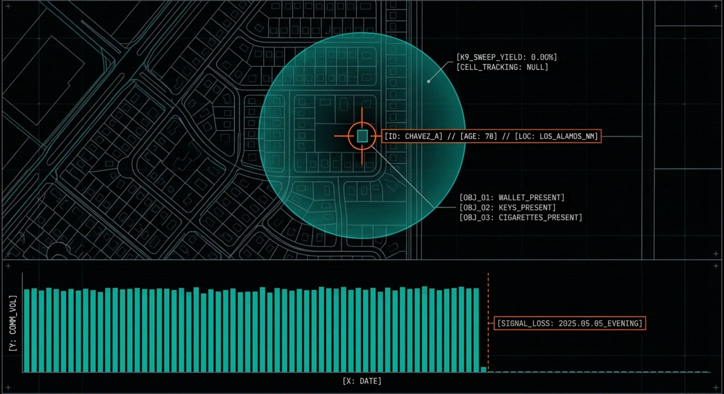 We have not been able to confirm Chavez’s specific role or division at LANL. That matters, and we are transparent about the limit. What we can confirm is that a longtime laboratory employee vanished from a town that exists because of the laboratory, six weeks before Reza and seven weeks before Casias, under circumstances that will look very familiar by the time you finish this briefing.