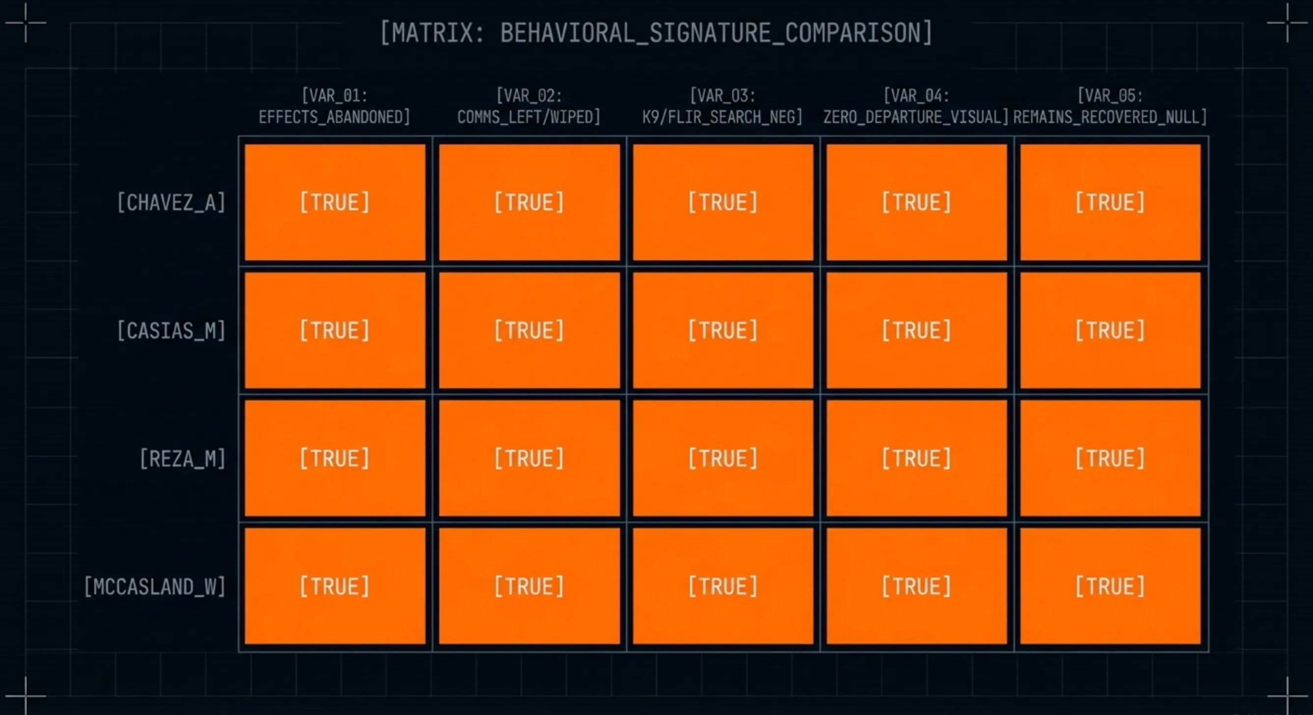 SENTINEL ASSESSMENT: We are not asserting that these disappearances share a cause. We are documenting that they share a signature. The physical evidence at each scene, the negative results from every search technology deployed, and the complete absence of any confirmed sighting or remains describe the same event happening to different people across two corridors.