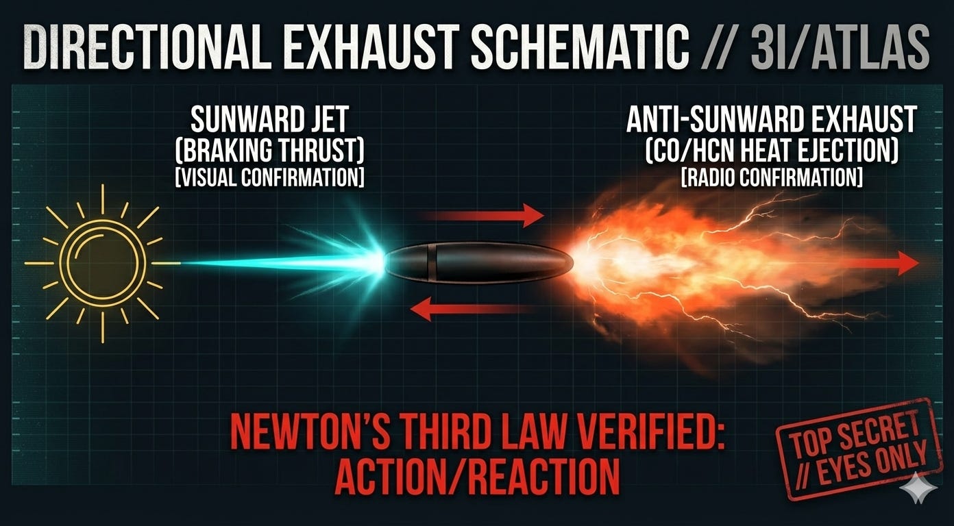 Cross-reference with the Dossier, Anomaly V: The Sunward Jet. 3I was photographed with a jet pointing toward the Sun — a retro-thrust signature, like a braking rocket.