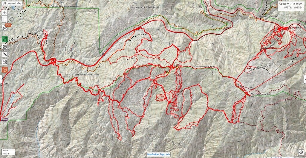 Three hikers departed the 6000 Foot Day Use parking area on Angeles Crest Highway at approximately 9:10 a.m. Coordinates: 34.349583, -117.962806. Pacific Crest Trail crossing at Highway 2. Ridgeline terrain, 7,000 to 8,000 feet. Challenging but well-maintained.