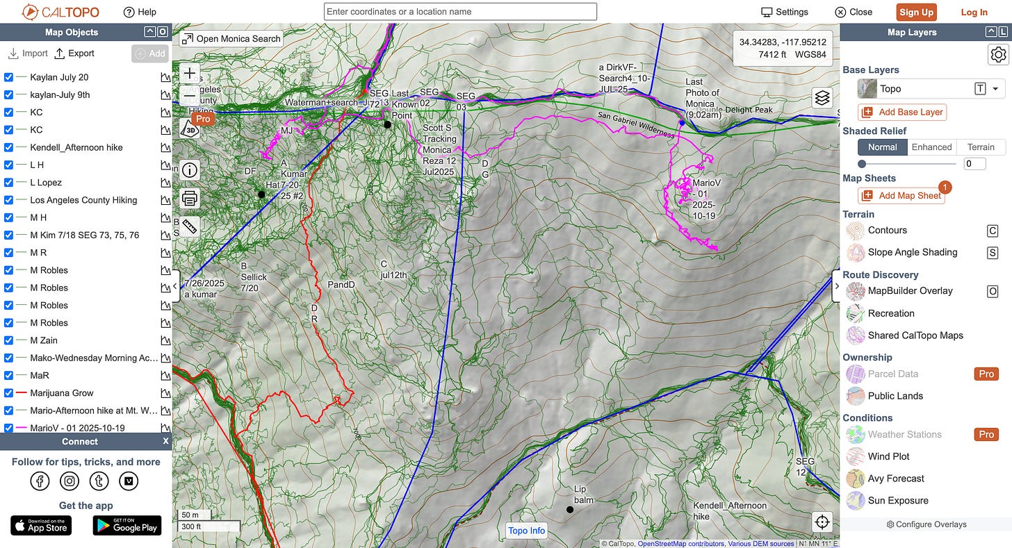 They mapped every search track on CalTopo to prevent overlap across a 40 to 50 mile radius. They ran canines. They deployed what Vienna described as “forensic technology, photography, airships (drones), canines, and other specialized tools” with “nearly no available resource untapped.”