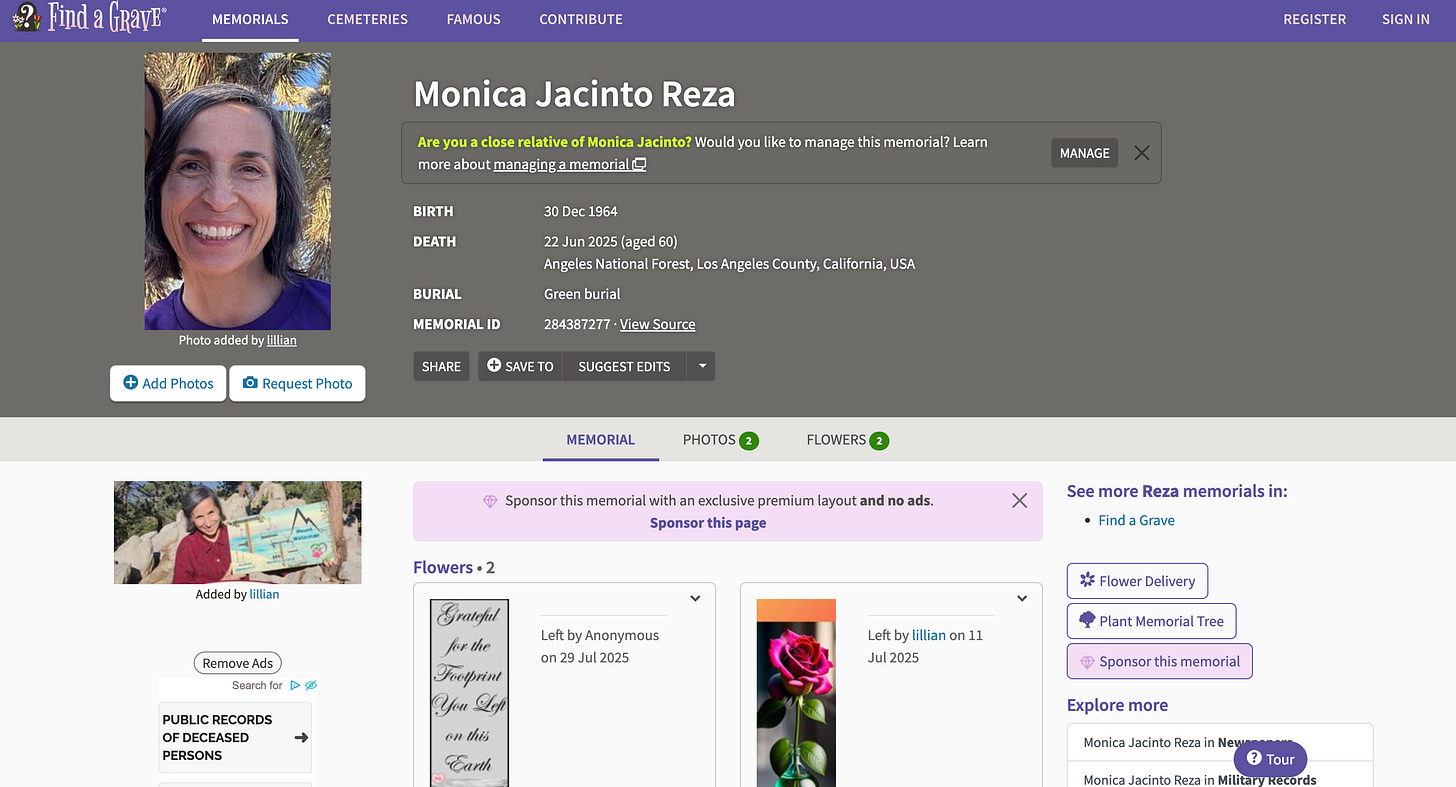 Memorial ID 284387277. Monica Jacinto Reza. Born December 30, 1964. Died June 22, 2025. Death location: Angeles National Forest, Los Angeles County, California, USA. Remains: Green burial.