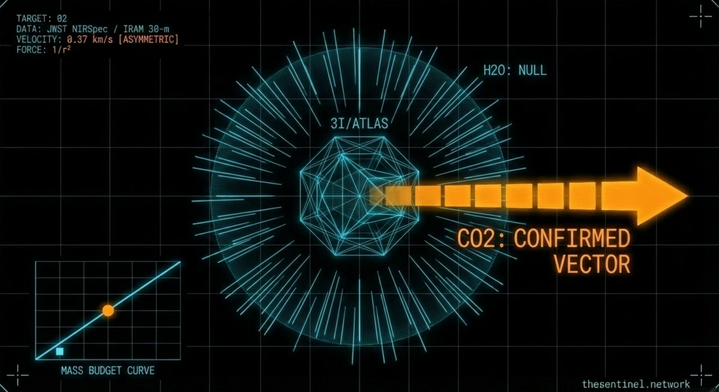 THE CURATED ORBIT documented the non-gravitational acceleration profile as most consistent with a 1/r² force — the signature of CO2-dominated thrust pointed toward a precise Jupiter intercept.