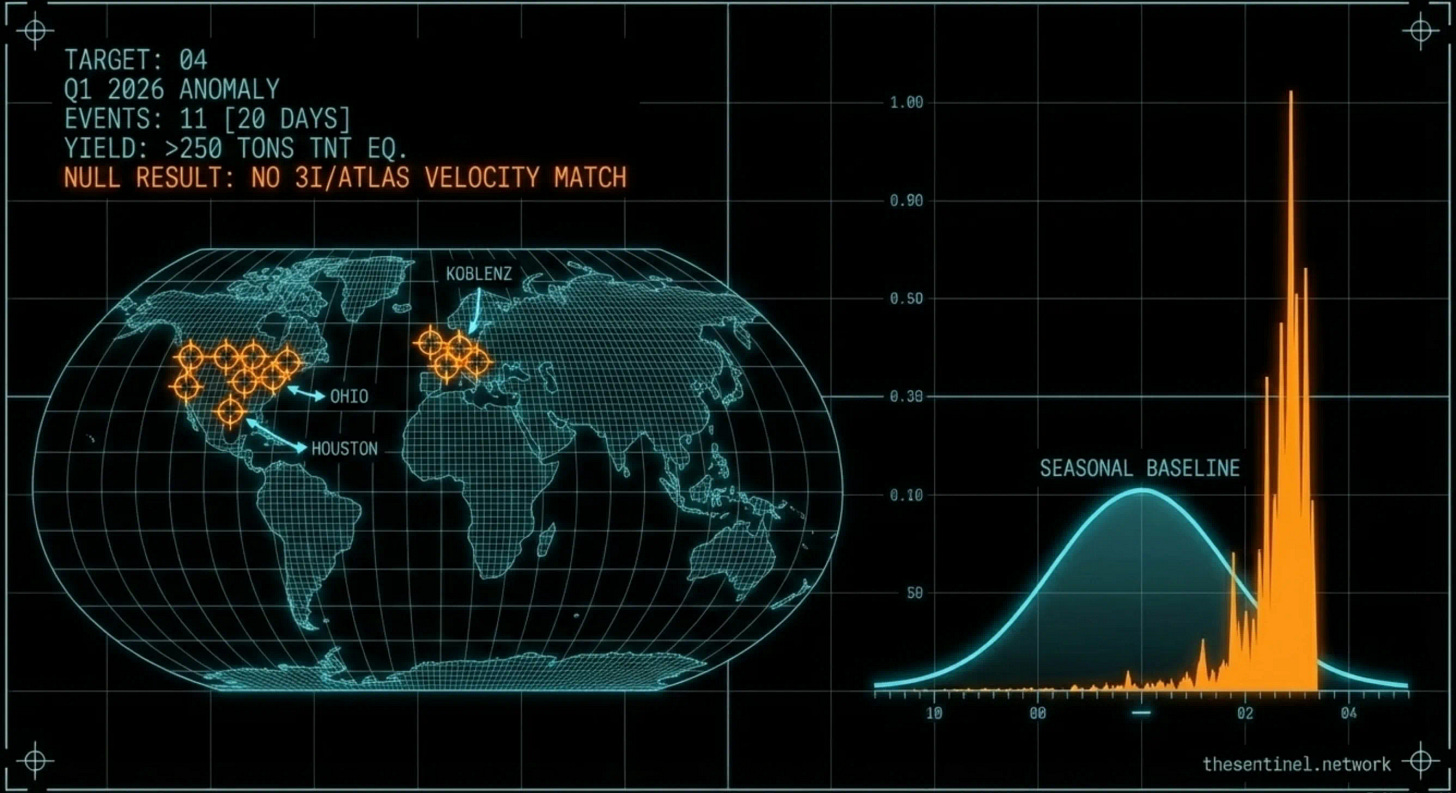 Three days. That is the gap between our special report and the AMS statistical confirmation. We compiled eleven events across four continents and published the pattern. The AMS ran the numbers and confirmed Q1 2026 was more than double baseline. NASA tried to attribute it to seasonal effects. The AMS disagreed the same day, showing the signal peaks in March where the seasonal model peaks in February. Then NASA’s own planetary defense officer admitted the detection infrastructure would have provided “very little time, if any” for the Houston strike. The pattern recognition was ours. The statistical confirmation was theirs. The admission was NASA’s. That three-step sequence — independent publication, institutional validation, institutional admission — is the model for every signal in this series.
