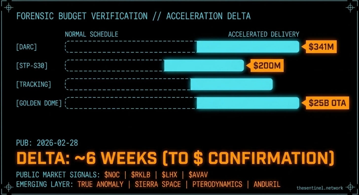 Defense programs do not run ahead of schedule. Sierra Space delivered tracking satellite structures three months early. Rocket Lab executed STP-S30 five months early. DARC Site 1 completed three months early. Three separate programs, three separate contractors, all ahead of schedule simultaneously. That is not efficient project management. That is pressure from above. Someone with authority told every node in this chain to move faster, and they did.