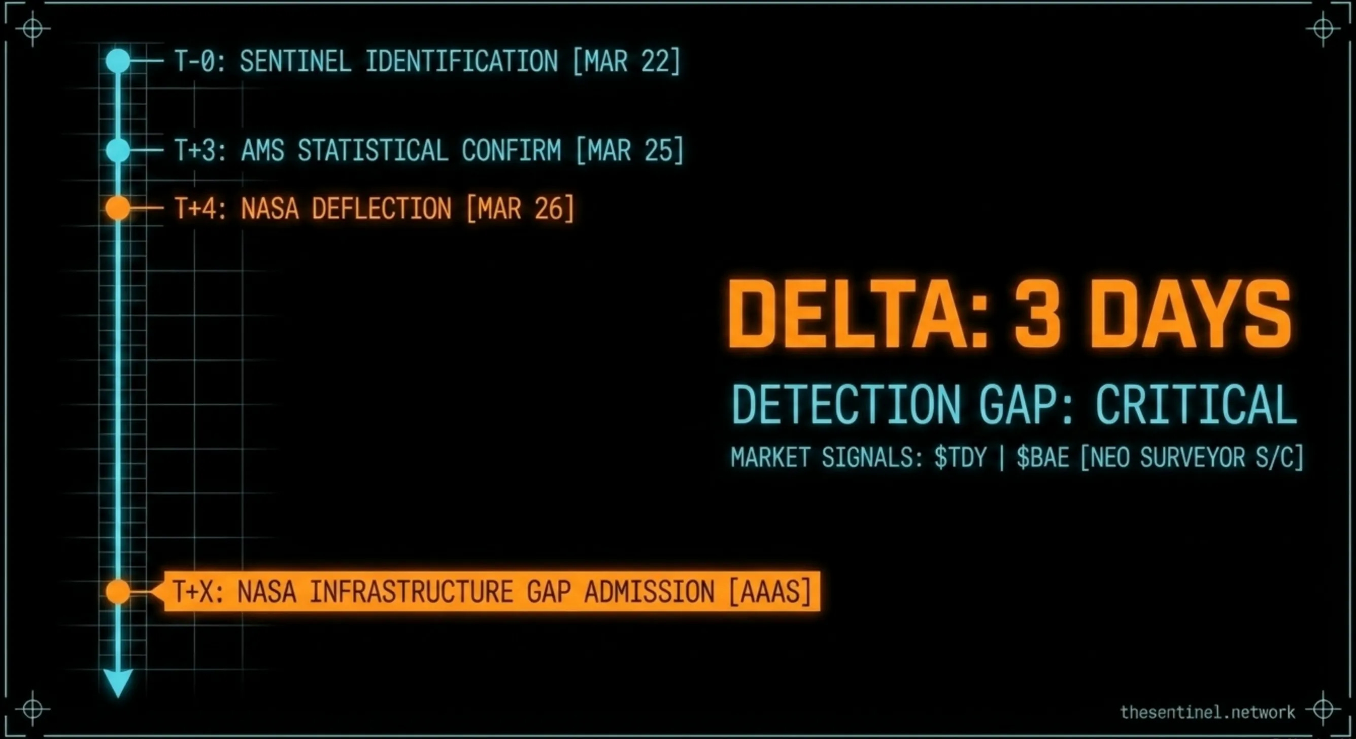 What you just read is the track record. Four signals. Four independent domains. In every case: The Sentinel Network published original forensic analysis before the institutions, the media, or the market caught up. The delta ranged from three days (fireball pattern → AMS confirmation) to three weeks (ATTRITION → two governments acting) to months (CO2 thesis built December through March → ESA confirmation April 2).
