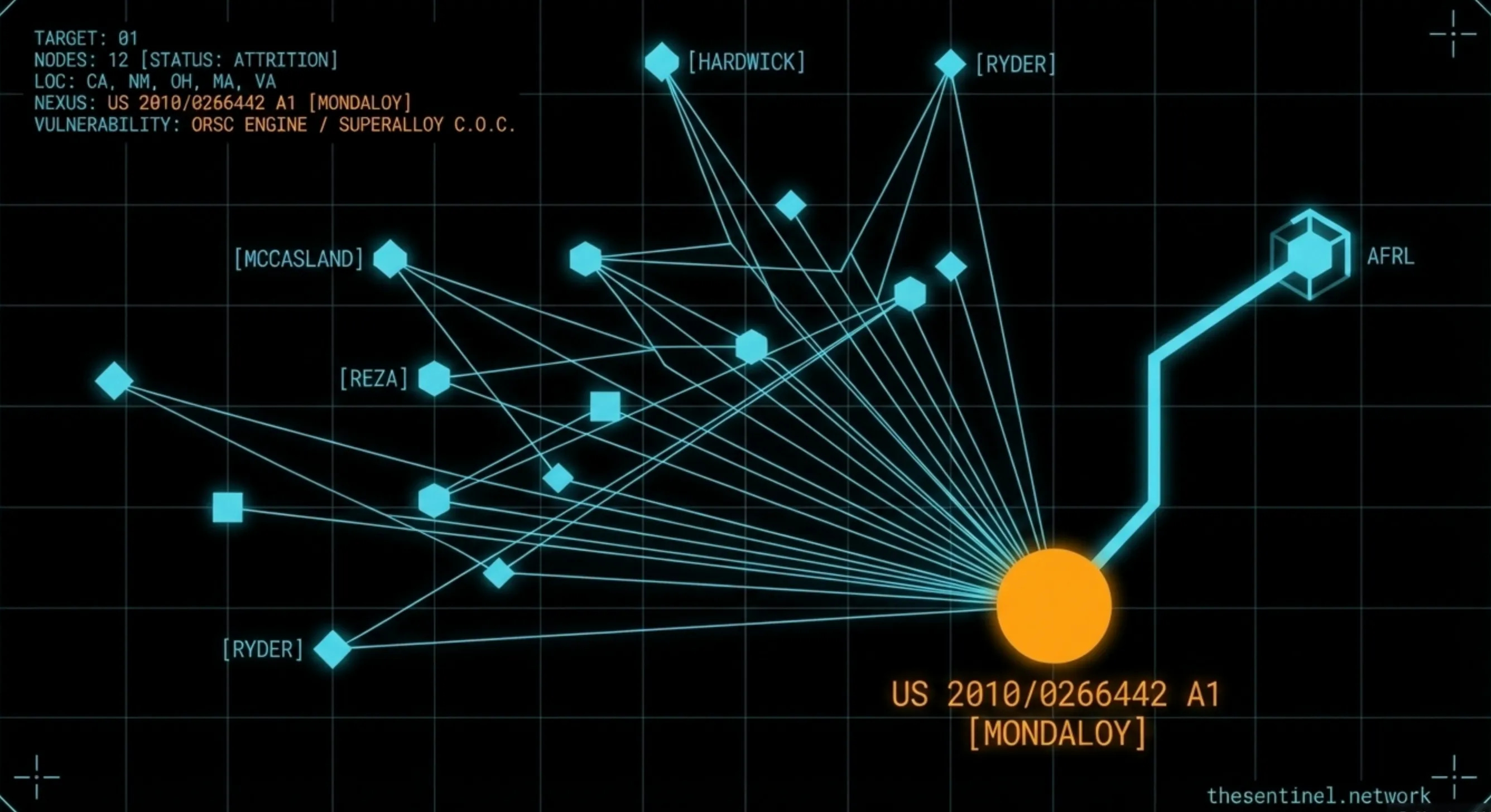THE GREEN BURIAL connected Monica Jacinto Reza, a Technical Fellow at Aerojet Rocketdyne and co-inventor of the Mondaloy superalloy (patent US 2010/0266442 A1), to McCasland through the AFRL Materials Directorate cost-sharing contracts that began in 1999. We documented that Dallis Hardwick, who co-invented Mondaloy with Reza at the Rockwell Science Center in the 1990s, later led AFRL’s materials research and reported through McCasland’s command structure. Three people held the complete chain of custody for the alloy America needs to build next-generation rocket engines. All three are dead or missing.