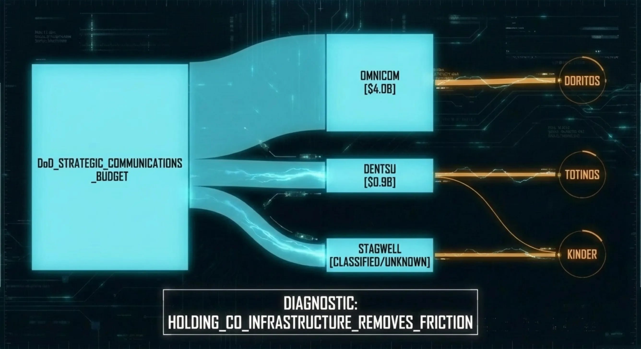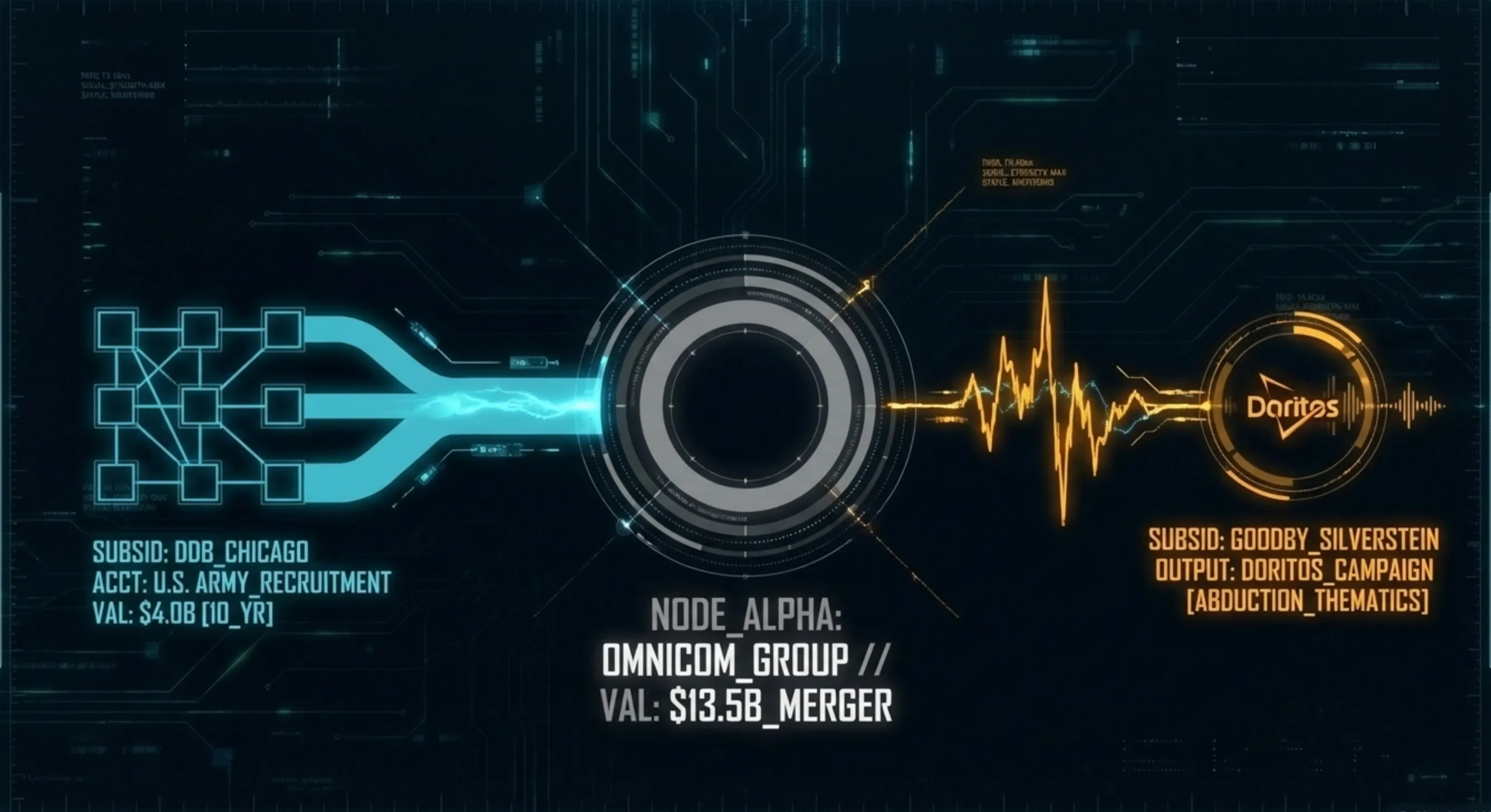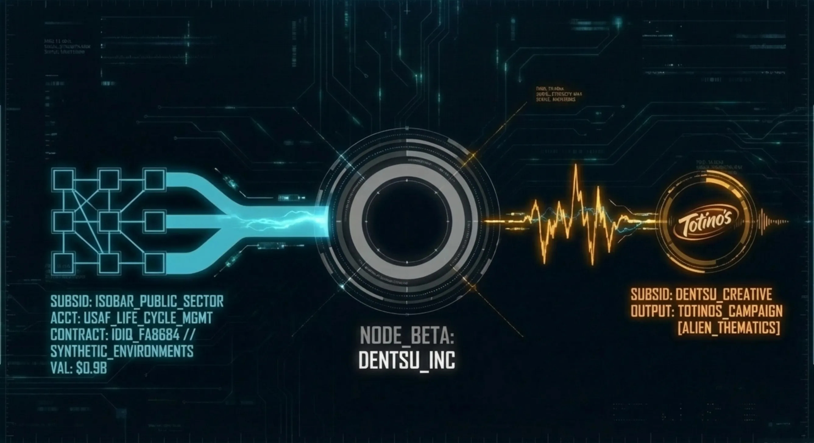 THE SENTINEL ASSESSMENT: The separation between government strategic communications and consumer advertising does not exist at the holding company level. Omnicom held the $4 billion Army marketing account while its subsidiary produced the Doritos alien ad. Dentsu holds a $900 million USAF IDIQ while its creative teams produced the Totino’s alien spot. These are not inferences. They are contract awards announced in the agencies’ own press releases.