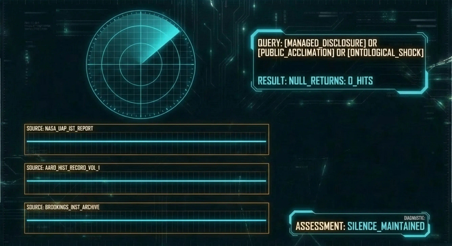 NASA’s UAP Independent Study Team report. AARO’s Historical Record Report. Sol Foundation symposia proceedings. RAND Corporation publications. Brookings Institution archives. Congressional hearing transcripts from July 2023 through September 2025. Every publicly available document where the words “managed disclosure,” “public acclimation,” or “ontological shock” might appear.