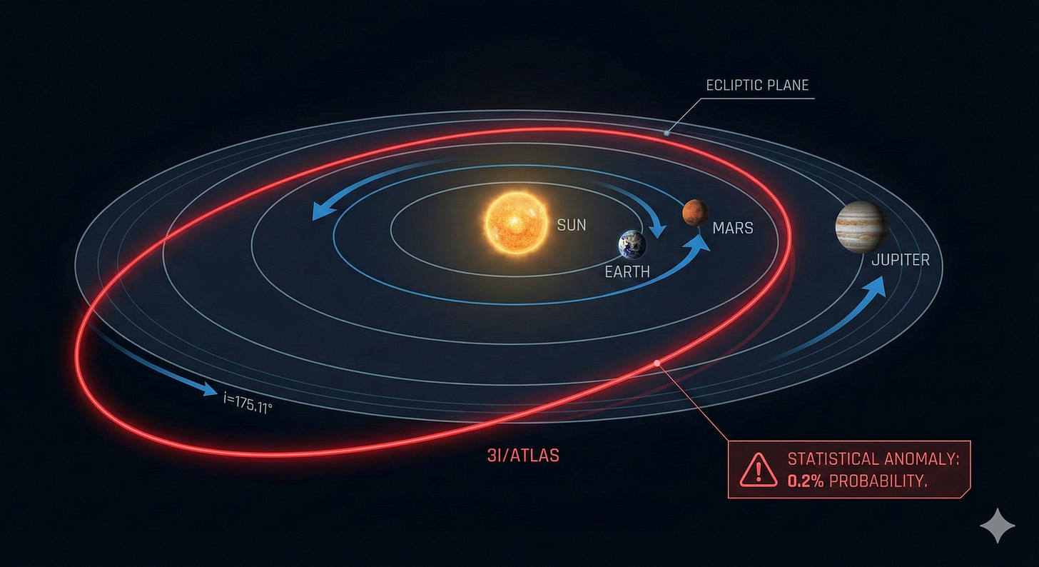 The Wrong Way Down a One-Way Street: 3I/ATLAS has an inclination of 175.11°. It is orbiting retrograde (opposite to the planets) but is almost perfectly flat within the ecliptic plane. The odds of a random rock from deep space hitting this specific alignment are 0.2% (1 in 500).