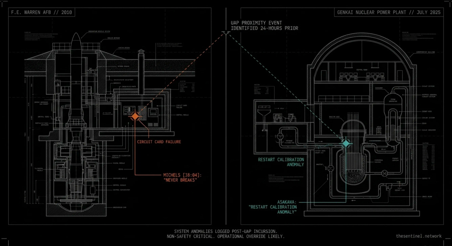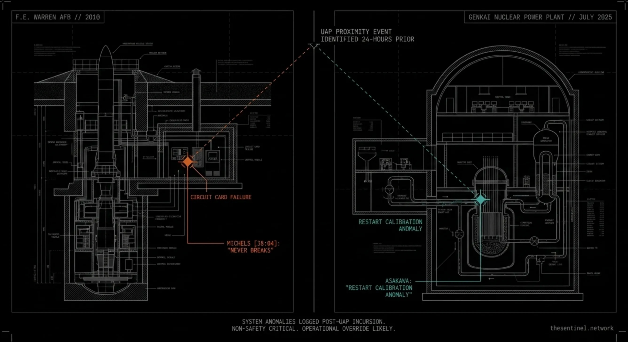 The Genkai and F.E. Warren parallel is the operational core of the interview. Two nuclear facilities, two countries, two sets of unexplained electrical anomalies correlated with unexplained aerial phenomena. The Japanese caucus is building its domestic case for UAP scrutiny around nuclear facility security. The American argument provides the template.