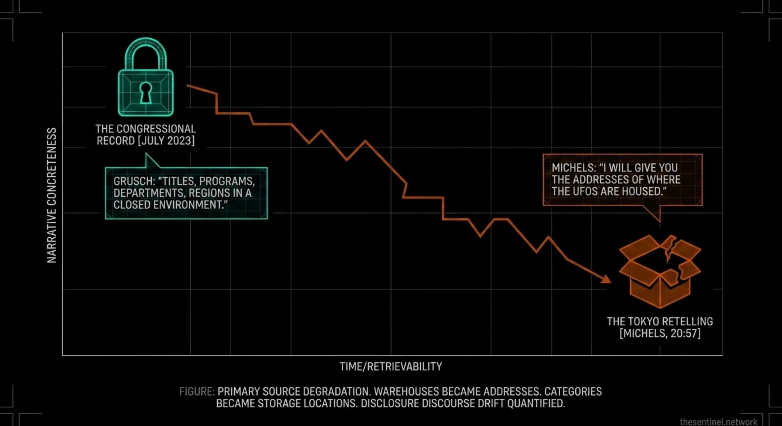 But Michels’ retelling drifted in two directions at once. He attributed the moment to the wrong member of Congress. And he rendered “I know the exact locations” as “I will give you the addresses of where the UFOs are housed.” Both drifts increase specificity beyond what the record supports. A testimony about cleared locations already disclosed to the Inspector General becomes, in the Tokyo retelling, the promise of addresses about to be handed over.