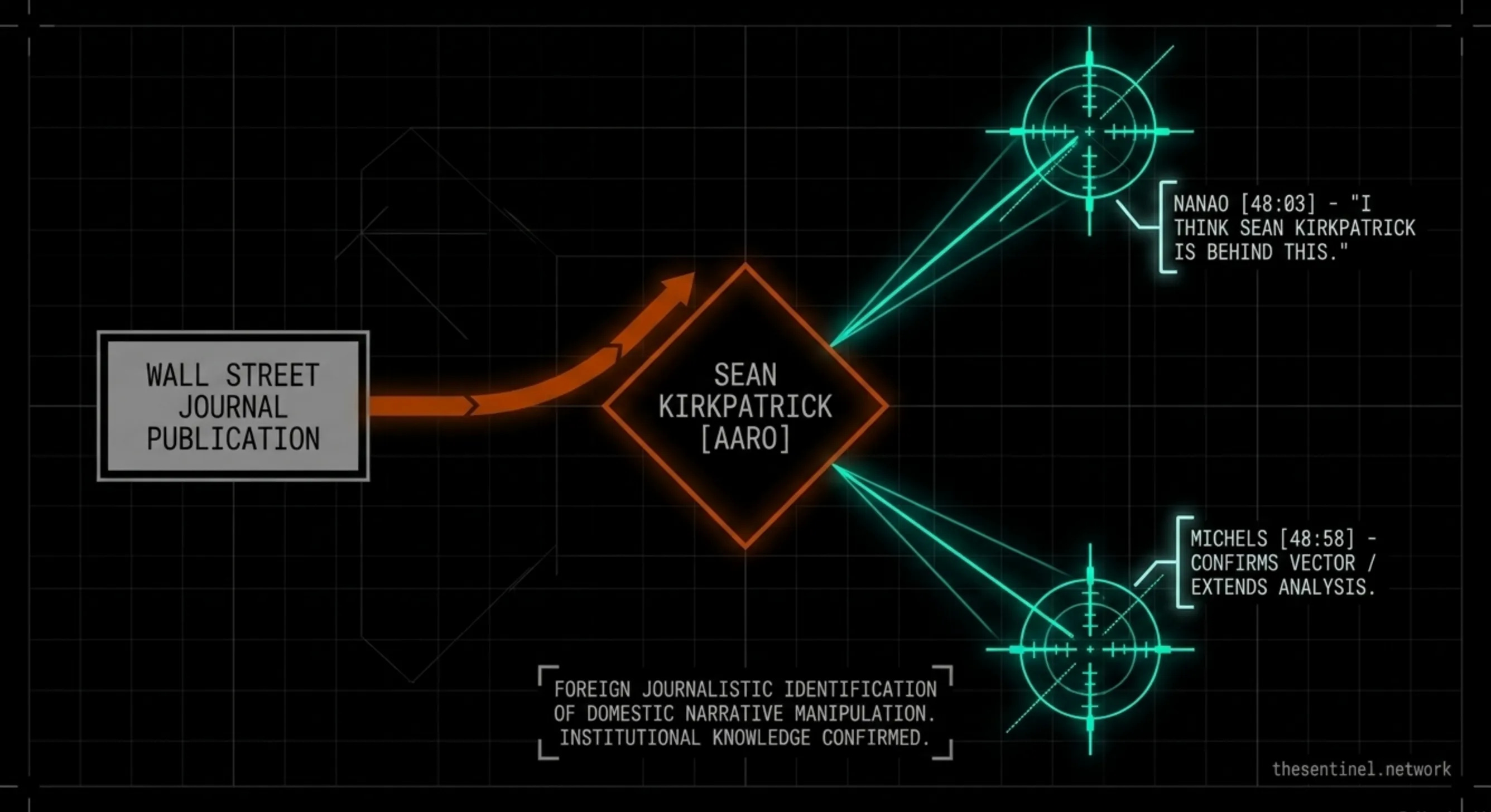 Nanao named Kirkpatrick. At 48:03, Nanao advanced his own thesis: “I think Sean Kirkpatrick is behind this.” He was referring to a Wall Street Journal article he characterized as a Pentagon disinformation effort. This is not a Japanese journalist asking an American guest to explain the landscape. This is a Japanese journalist telling the American guest what he already believes about a specific named U.S. official’s role in shaping the narrative.