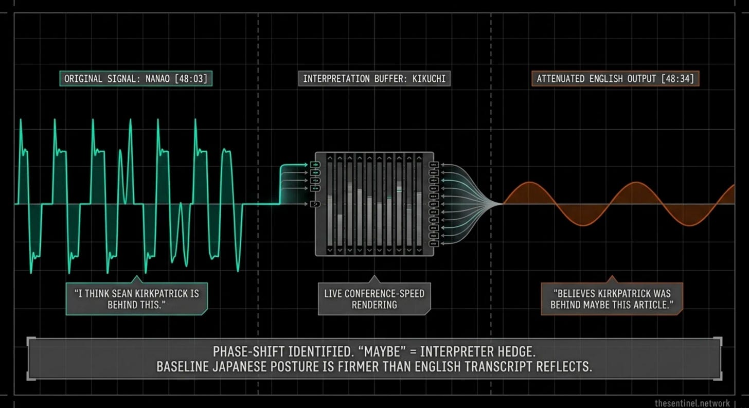 The “maybe” is an interpreter’s hedge. It is not in the original Japanese claim. It softened the accusation by one degree before it reached the English-speaking guest.