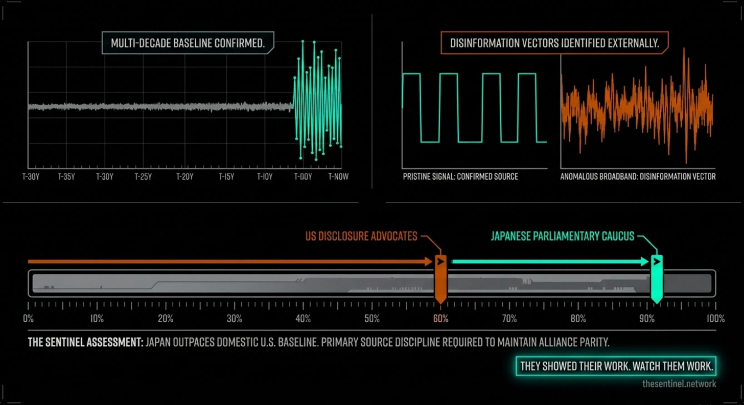 An American disclosure advocate with significant audience reach traveled to Tokyo and briefed a Japanese political caucus and a Japanese national journalist on the current state of the U.S. conversation. The caucus and the journalist already knew most of it. They pressed on the weak points. They introduced their own analysis, including a specific named U.S. official as a suspected disinformation source. They drew connections between Japanese nuclear facility incidents and American ones. They referenced forty years of domestic Japanese UAP cultural history that most American disclosure figures have never encountered.