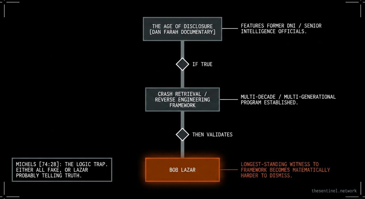 On the logic trap. At 74:28, Michels made the most compressed argument of the broadcast. “You can’t accept that we’ve had a multi-decade, multi-generational crash retrieval and reverse engineering program, which is, you know, it’s the number one documentary on Amazon. All these high-up intelligence officials, including former directors of national intelligence that oversaw CIA, NSA, literally everything. And they’re taking place in a movie whose thesis is that we have crash retrievals, reverse engineering. You can’t accept that and then not accept the one guy who’s coming forward with a very complete story around crash retrievals and reverse engineering. So either it’s all fake or if there are crash retrievals and reverse engineering programs, Bob Lazar is probably telling the truth.”