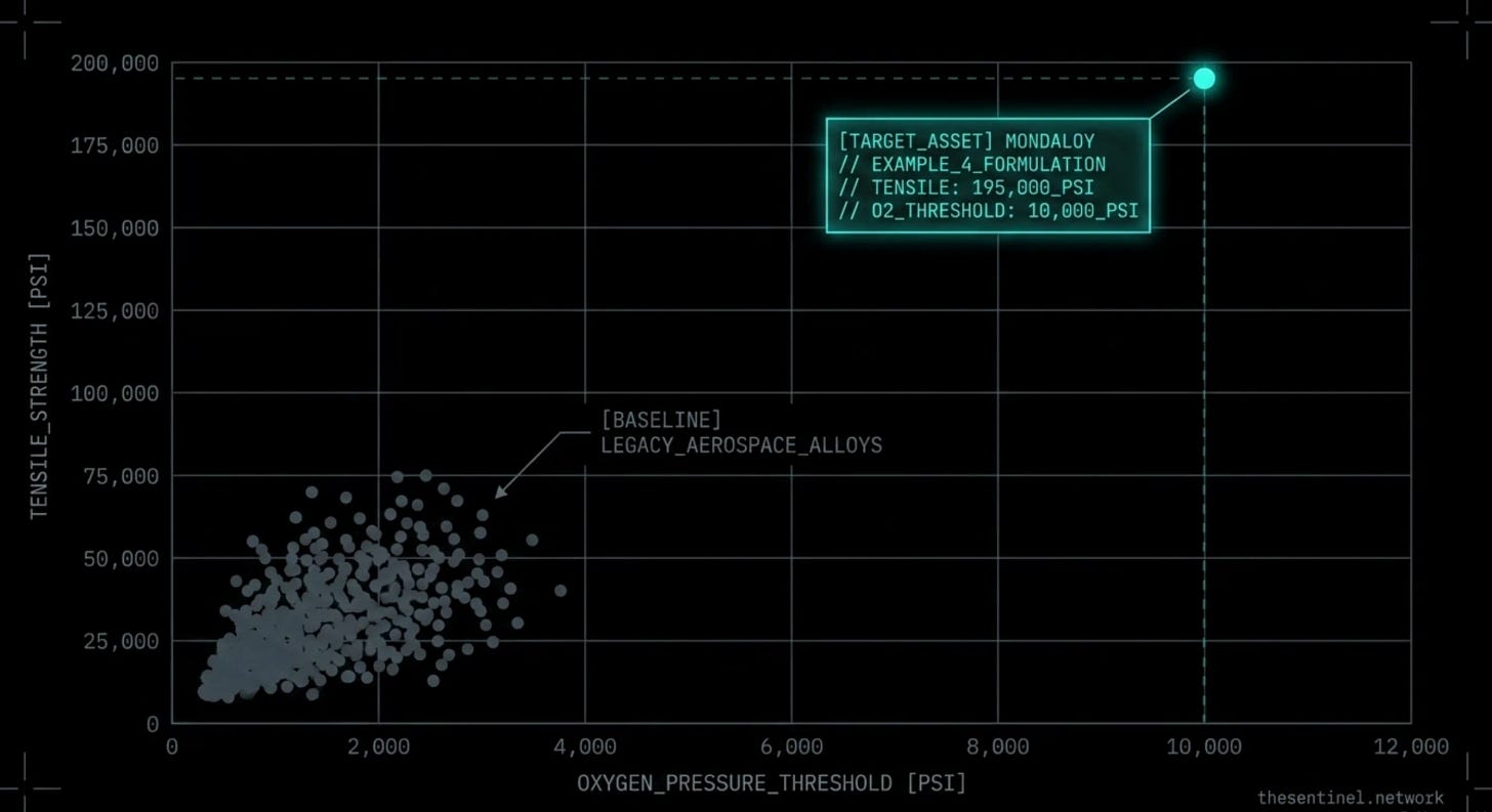 The Mondaloy patent itself describes the specific performance numbers. Example 1 in the filing: an alloy composed of 71.5 percent nickel, 16.5 percent cobalt, 8 percent chromium, 2.5 percent titanium, and 1.5 percent aluminum. That alloy survives at up to 10,000 pounds per square inch of gaseous oxygen pressure. It holds a tensile strength of 170,000 pounds per square inch. Example 4 in the same filing pushes tensile strength to 195,000 psi. Those are not incremental improvements. They are rewrites of what American materials science believed was possible.