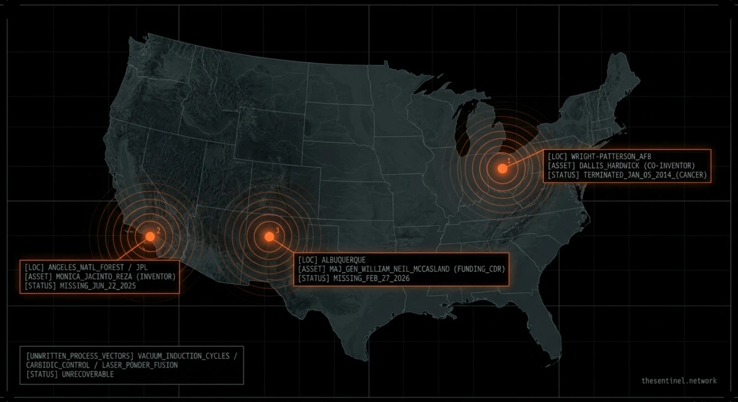 THE LONG COUNT and THE WITNESS together track thirteen names across the defense, aerospace, and national security research communities who have died or disappeared in a twenty-two-month window beginning May 2024. Three of those names have a documented institutional relationship to Mondaloy: Hardwick (co-inventor, dead), Reza (inventor, missing), McCasland (funder, missing).