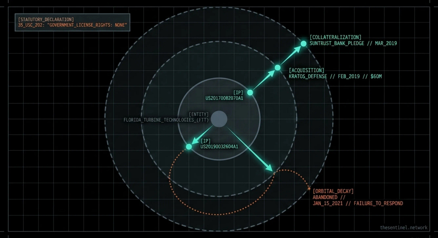 Six days later, Kratos pledged the FTT patent portfolio, including the Mondaloy coating patents, as collateral to SunTrust Bank. The recorded USPTO assignment lists seven entities as assignors: Consolidated Turbine Specialists LLC, Elwood Investments LLC, Florida Turbine Technologies Inc., FTT America LLC, KTT Core Inc. (the new Kratos Turbine Technologies subsidiary), S&J Design LLC, and Turbine Export Inc.