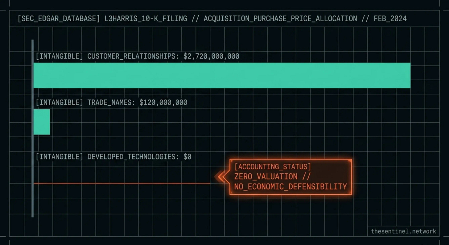 L3Harris’s accountants reviewed the full propulsion and energetics intellectual property portfolio of Aerojet Rocketdyne, including the Mondaloy family, and assigned no standalone value to any of it. The entire intangible value of the acquired company, on the acquirer’s books, is a list of customers and a set of names to print on boxes.
