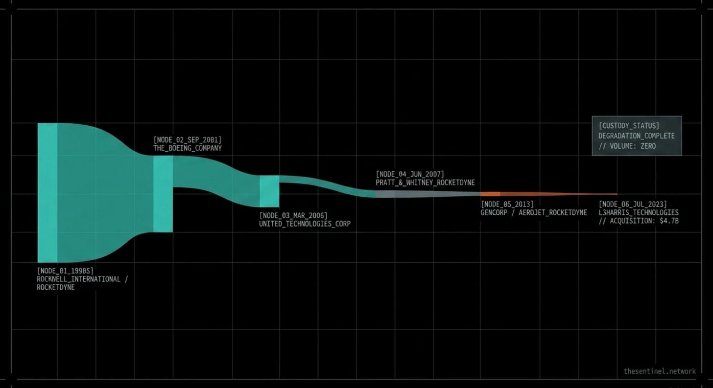 By the time this happened, UTC was selling Pratt & Whitney Rocketdyne to GenCorp. The GenCorp/Aerojet deal closed in June 2013, six months after the patent death. Nobody revived it. Nobody refiled it. The composition of Mondaloy entered the public domain, unprotected, in a moment of corporate distraction.