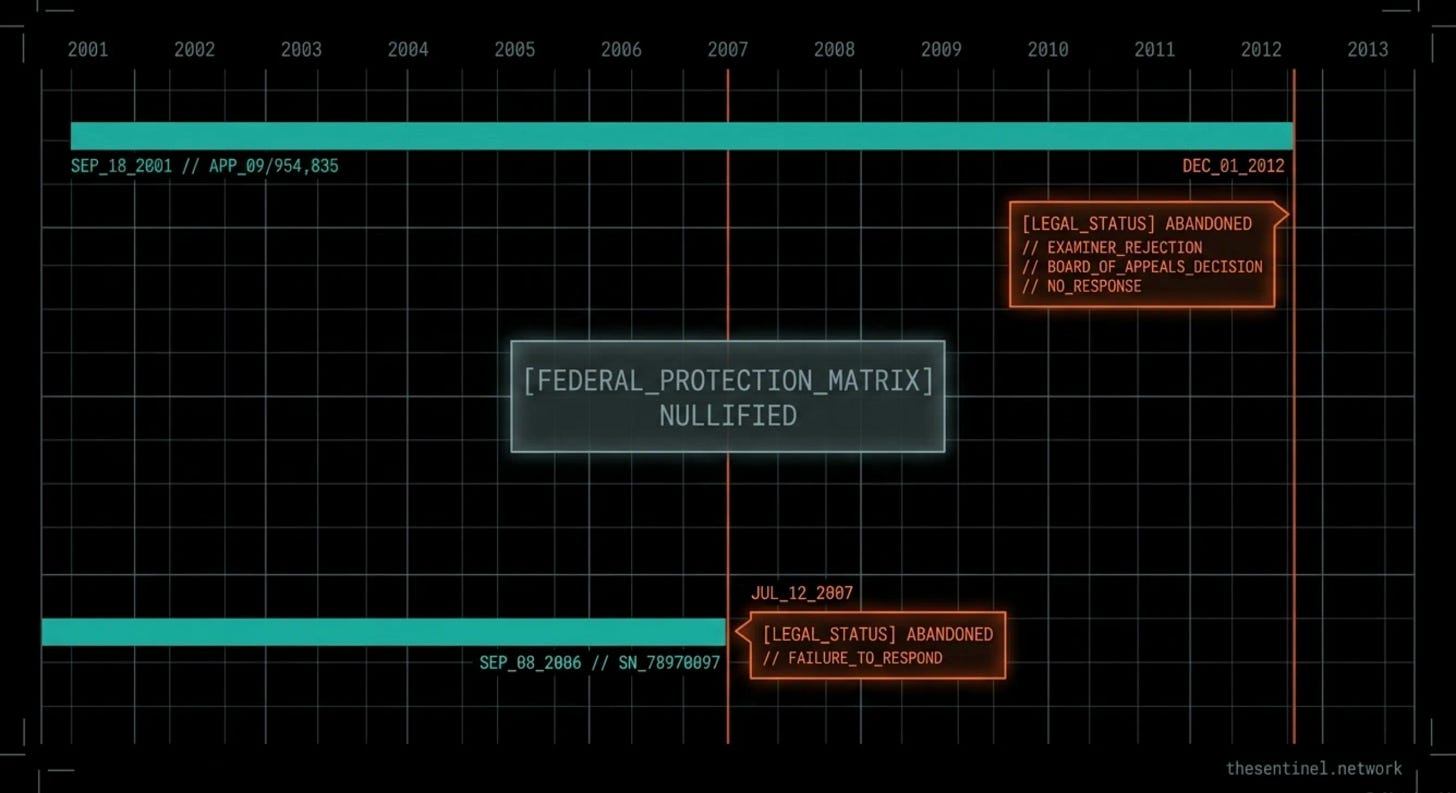 Hardwick is dead. Reza is missing. McCasland is missing. The patent family is abandoned. The trademark is abandoned. The Russian state has a copy of the recipe. The acquirer has booked the IP at zero.