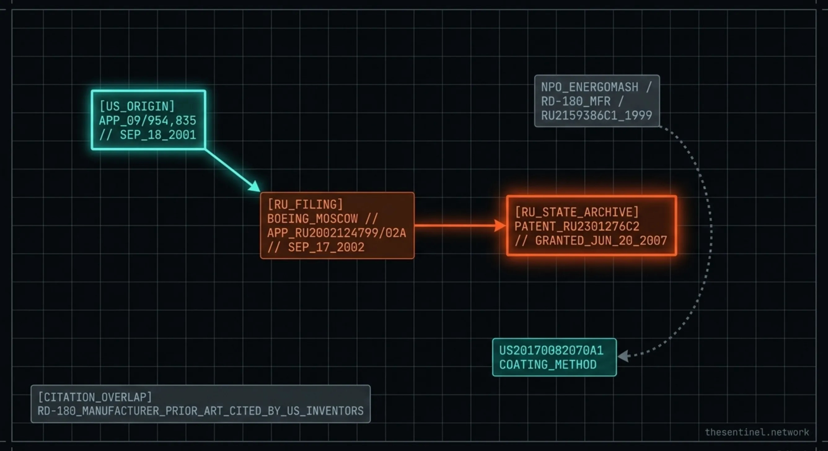 The alloy designed to end American dependence on Russian rocket engines sits in the Russian state archive, translated and granted nineteen years ago. The downstream American coating-application patent cites the RD-180 manufacturer’s own cermet-coating patent as prior art. These are not conspiracy claims. They are citations in the US Patent and Trademark Office’s own database.
